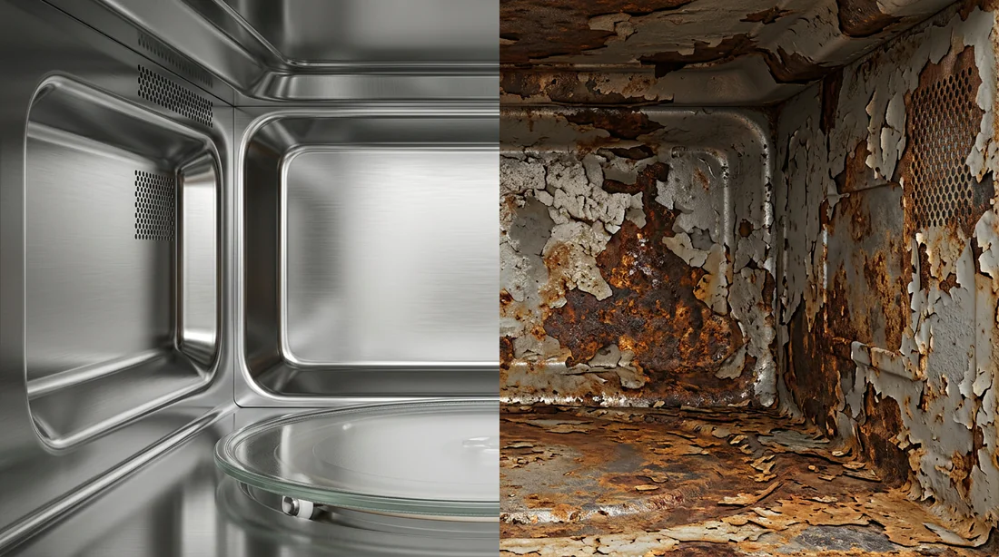 La corrosion de la carcasse s'accélère très vite. Sans sa barrière protectrice, l'acier rouille à une vitesse folle. Une paroi perforée par la rouille rend l'appareil totalement inutilisable et extrêmement dangereux. Il perd sa capacité à retenir les ondes à l'intérieur de la cuve.